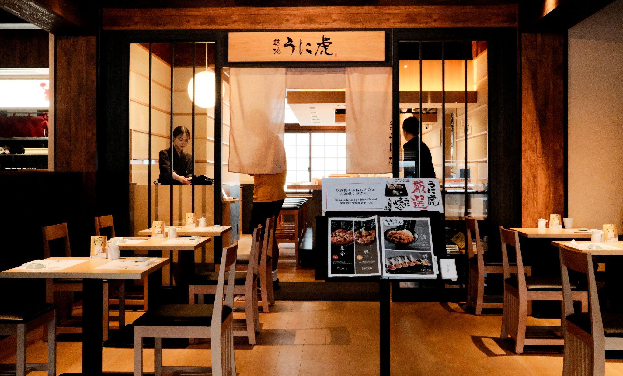 豐洲市場的餐廳們分散在好幾棟. うに虎在去年新開的「千客萬來」. 「千客萬來」三樓一整層樓都是餐廳,絕大多數都是美食街的形式. 也就是買了食物可以隨便坐,或一家人買不同攤的東西但一起吃. 虎屋有自己餐廳,但也可以坐美食街的位子. 小蜜蜜不點餐不好意思佔餐廳位子所以坐美食街,但服務生一樣服務我們.