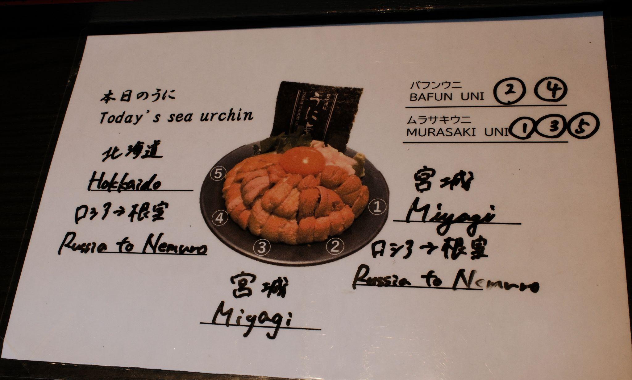 兩種是馬糞海膽(bafun uni), 三種是紫海膽(murasaki uni). 除了外型的不同之外, 一般來說馬糞海膽比較甜, 紫海膽比較清淡. 老實說我也不很懂, 但大家相信我每一種都有微妙的不同.