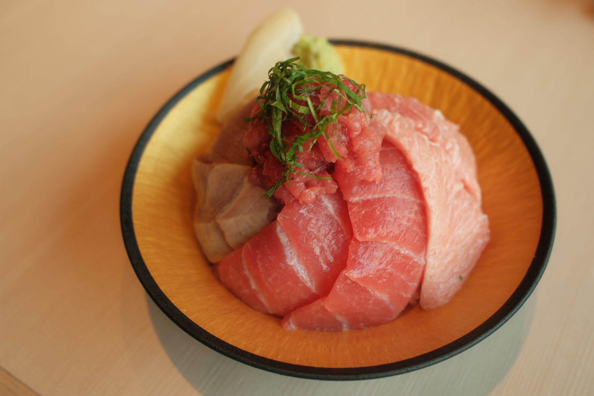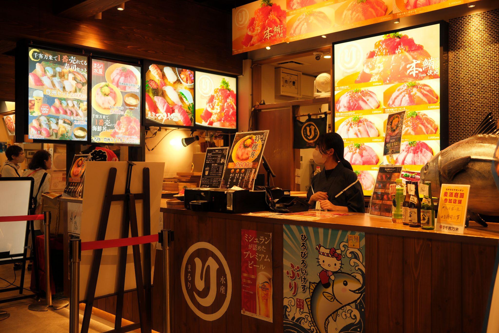 TeamLab 完之後三點肚子又餓了 (當然啊, 午餐十點吃的), 又回到千客萬來找其他吃的. 稍早有一家鮪魚專賣店照片看起來不錯,人潮也多就選了這家 (まるり水産 ).