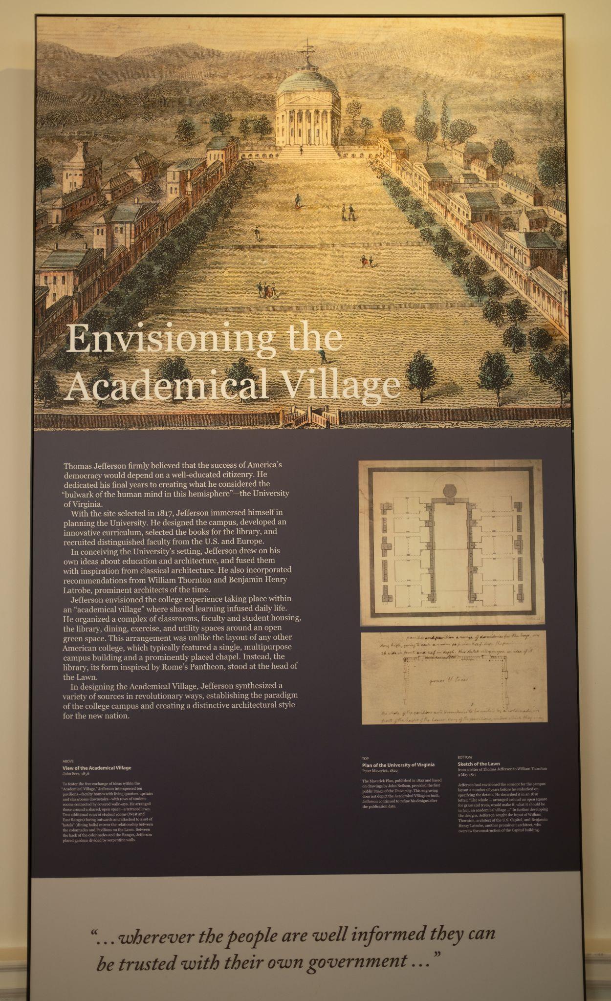 Thomas Jefferson有自己的一套教育理論. 他認為學習不是只在課堂, 而是生活中不斷地跟身旁的人互相學習. 大學生們不僅該住校更應該跟教授們吃住都在一起.