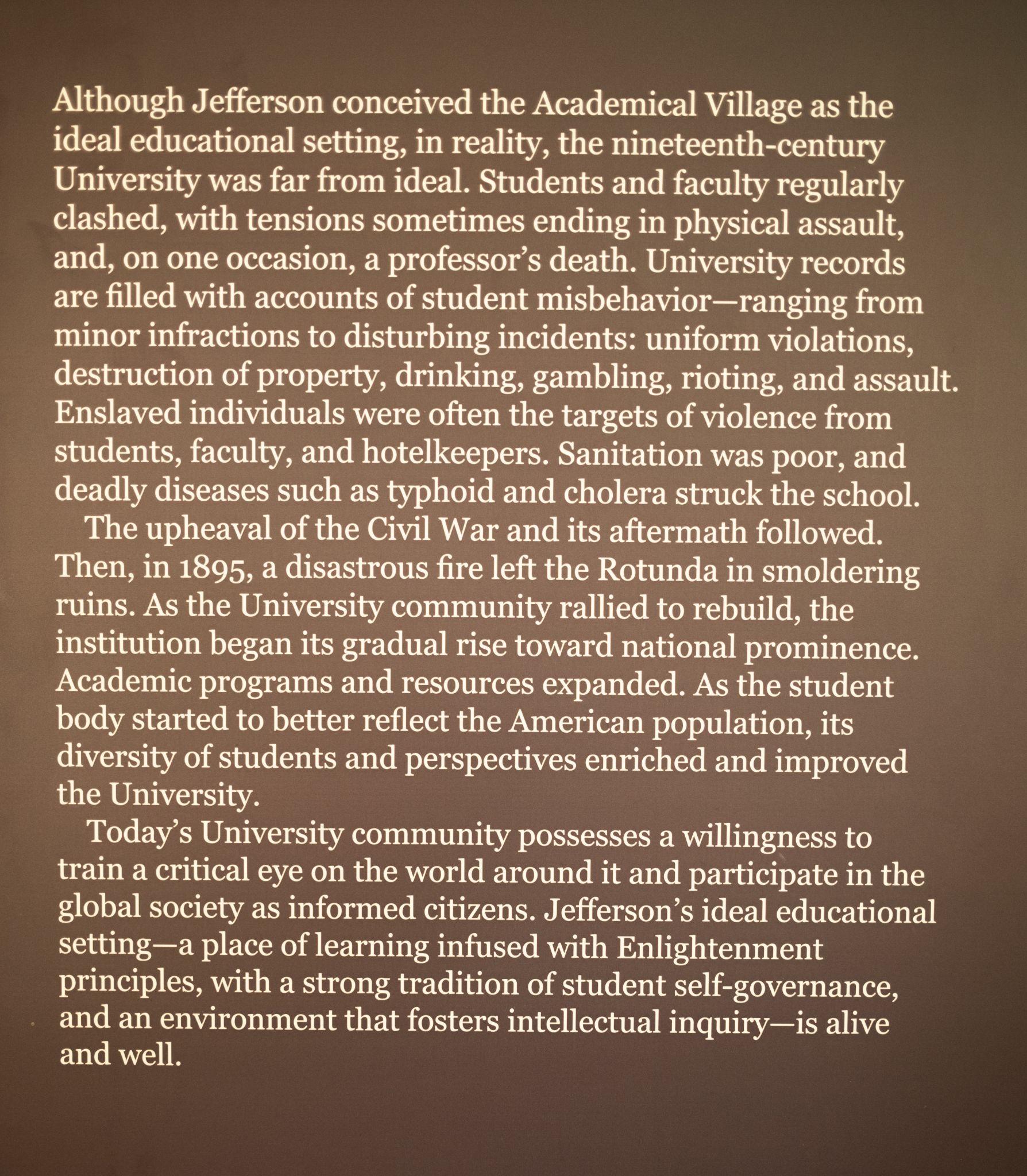 Rotunda的一樓有個校史館, 裡面就紀錄說這種學生與教授住在一起的安排太過理想化, 實際上是衝突不斷, 甚至造成一名教授死亡的案例.